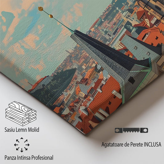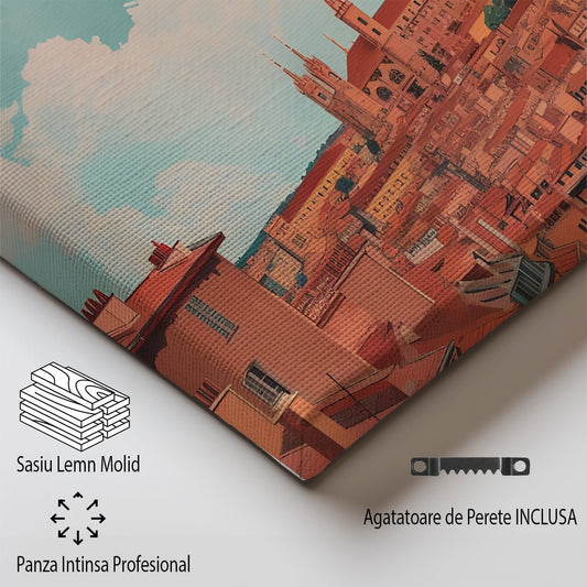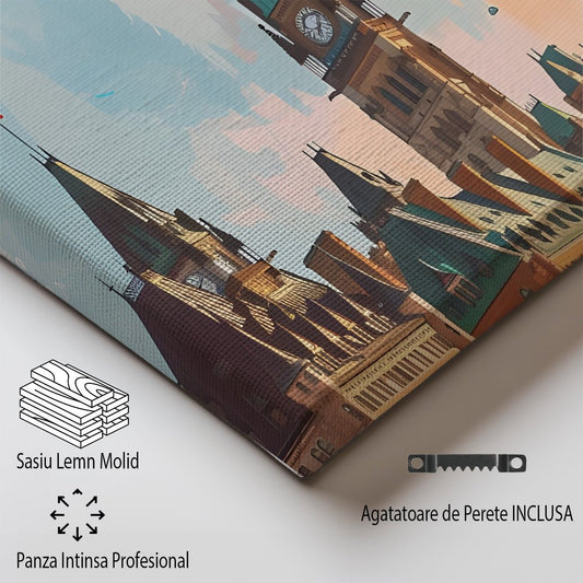 Tablou Canvas Print Praga turla inaltata peste acoperisuri colorate, stil vintage