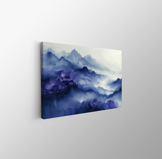 Tablou Canvas peisaj mistic cu flori albastre si munti invaluind orizontul | The Print Studio