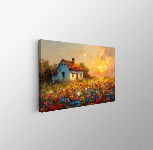 Tablou Canvas casuta rustica si camp de flori in lumina apusului | The Print Studio