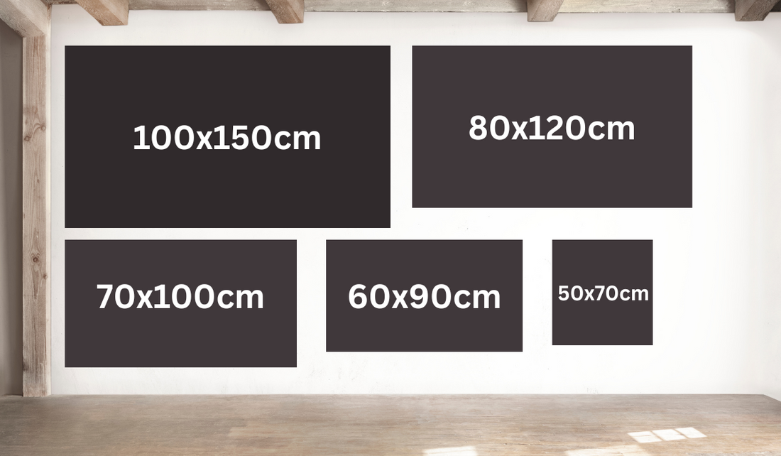 Imaginea cu ghidul de dimensiuni este orientativa si are rol informativ. Pentru a alege dimensiunea potrivita pentru spatiul dumneavoastra, va recomandam sa folositi o ruleta si sa masurati peretele unde va fi amplasat tabloul. Astfel, veti putea alege formatul ideal in functie de proportiile incaperii.